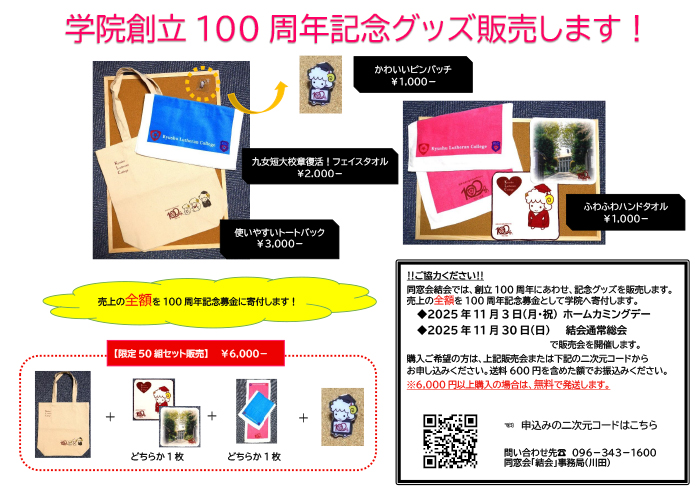 同窓会結会では、創立100周年にあわせ、記念グッズを販売します。